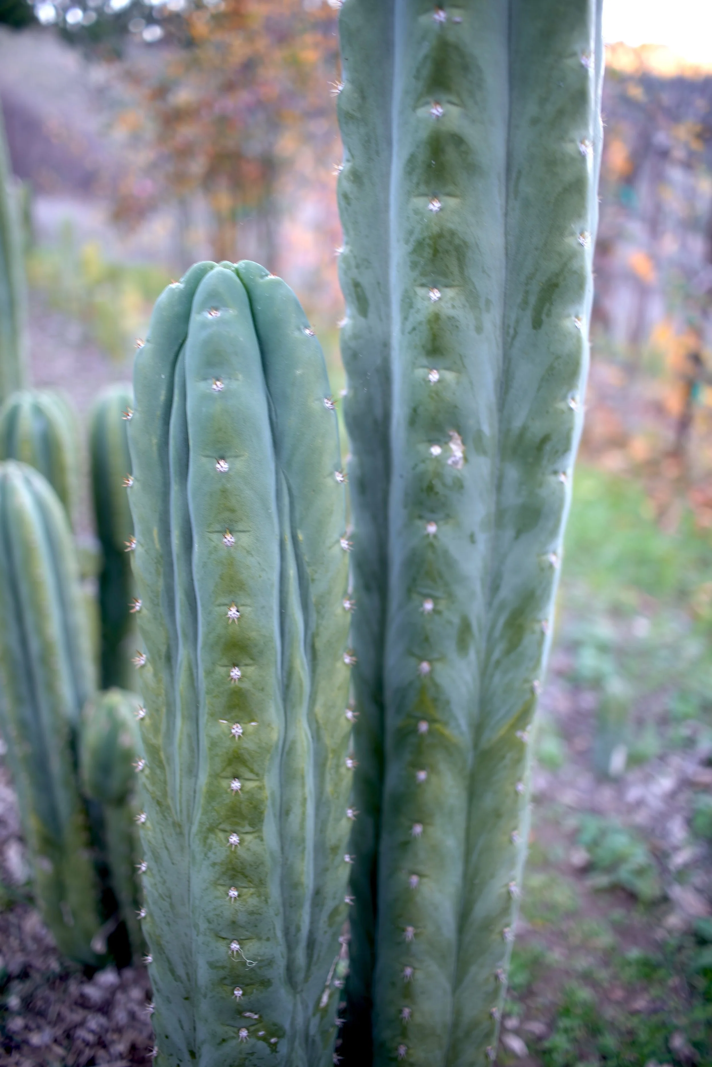 This cactus is fairly flat sided, which it probably got mostly from SS02. It is much fatter than a bridgesii though, probably like a smallish diameter pachanoi. The spines are larger than a typical Pachanoi, but not too much.. As of writing this, I’ve never seen Espiritu Cabra throw any long spines. I would call the color dark green and it develops a beautiful dark blue/green bloom. It has prominent chevroning. A chevron is a v shaped pattern, named after the horns of a goat (Che’vre in French), thus the name. Chevrons are a common design element, think of the logo of the oil company. One spring day I hit my head on a chunky Juul’s Giant and had to sit in the yard for hours recovering. Everything was flushing out with new green growth. I noticed this cactus across the yard and was visually fixated on it’s chunky form and vivid chevrons. Shortly after, I potted it up, then ended up planting it outside where it seems very happy so far. It has grown mostly 5 ribbed columns, with a percentage of 6 sided. It commonly grows what many in the trichocereus community seem to call cactussy, but which I call vagetative growth, the vagina-like wrinkles or folds that sometimes grow between ribs. I probably don’t have a cactus here that does that more. It looks really cool and who doesn’t want to see more things shaped like vaginas?
