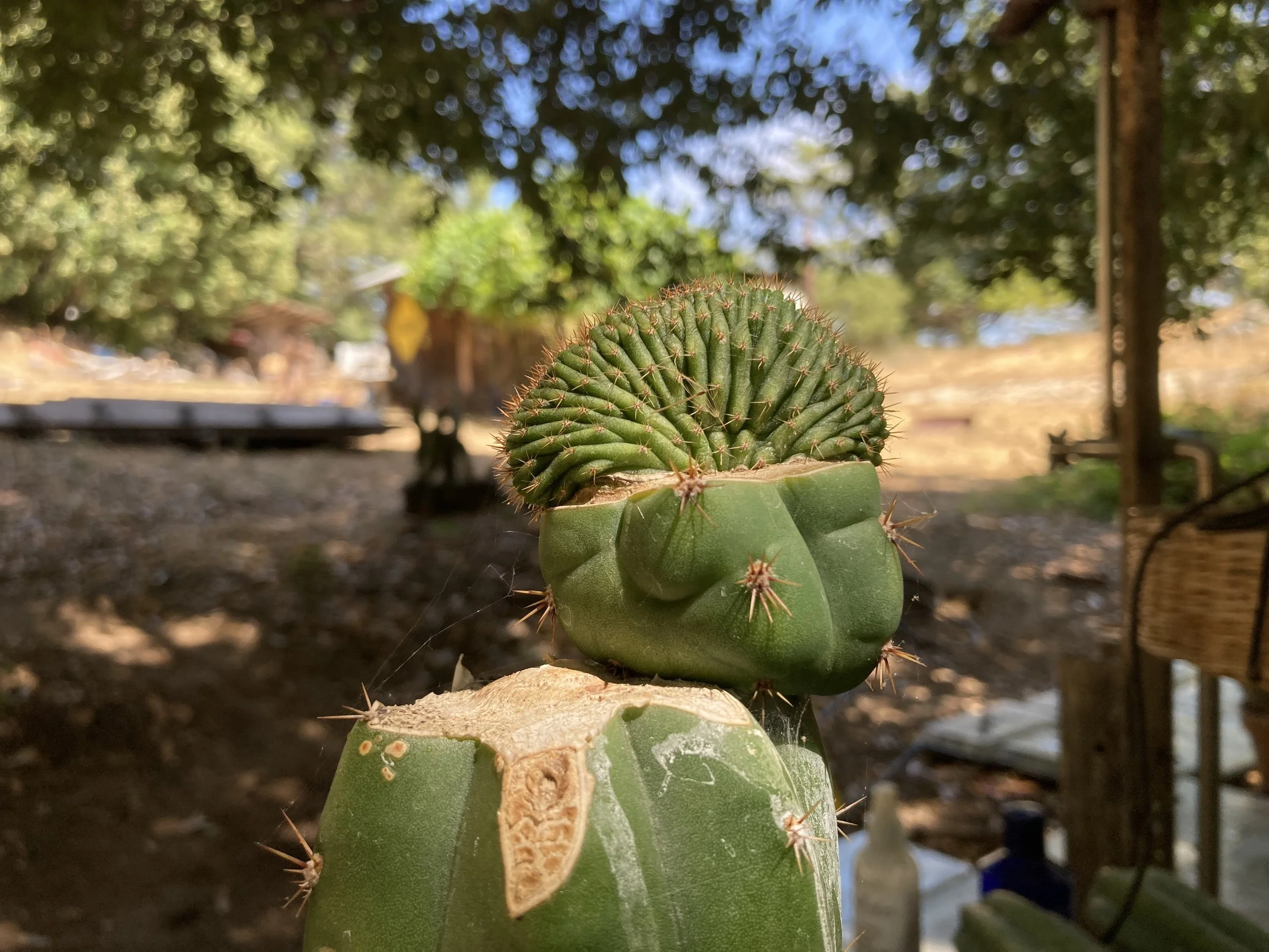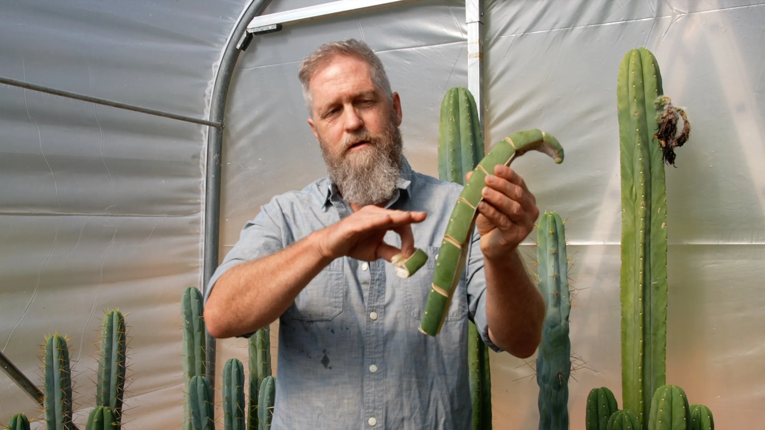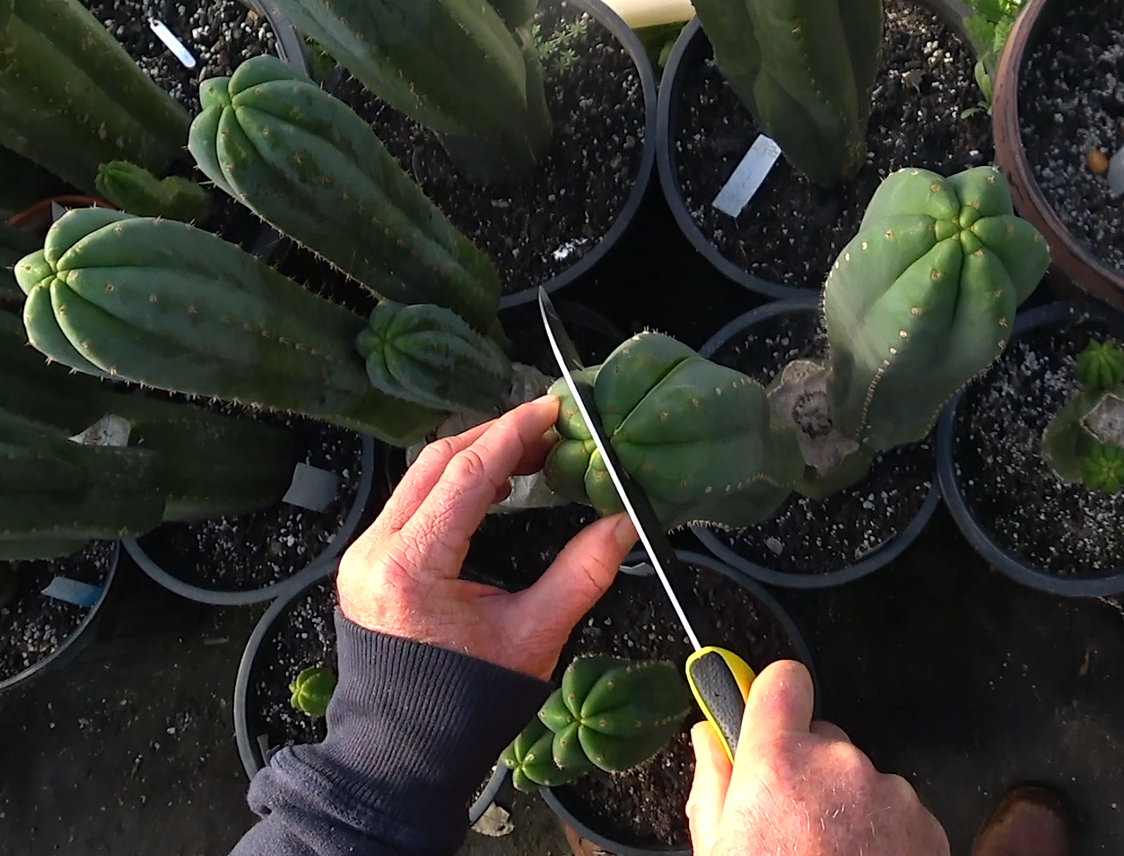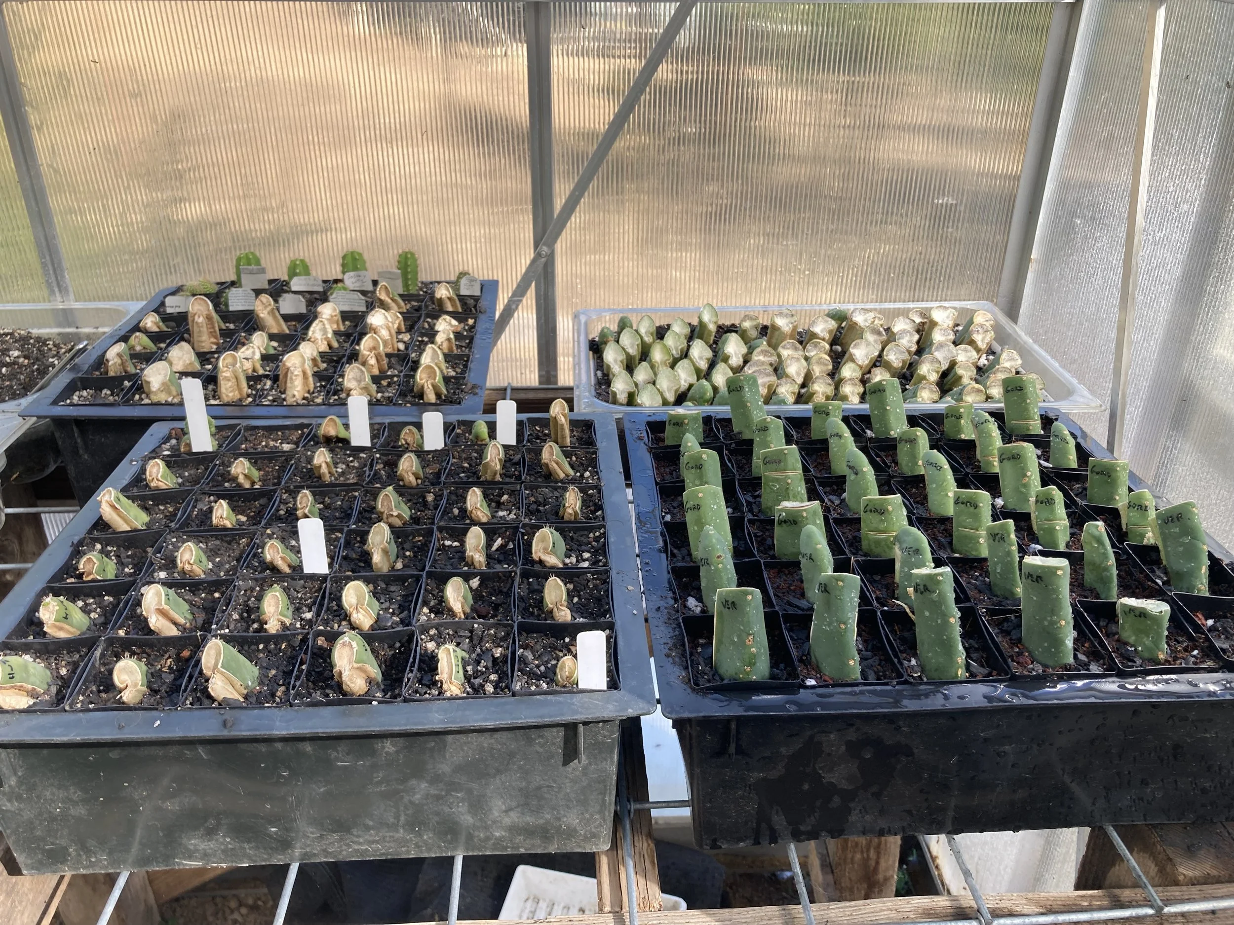 Originally I tried cutting fresh small sections of cactus to root. I had been starting to root some failed graft slabs and it seemed to be working. So a friend and I diced up a bunch of cactus into small bits to try rooting them. Most of them just dried up and died, even when curing in the shade. I noticed that pieces I grafted that ended up failing and coming off the grafting stock, were often still plump and would sit around for months seemingly unchanged. I realized the difference was that the grafts, although they failed in the end, were still receiving enough water from the grafting stock to remain hydrated as the cut surfaces of the graft slab were healing. I was also trying out an experiment of splitting the cactus into ribs, hoping that each rib would throw a pup, which could then be harvested, leaving the rest of the rib to sprout another. That did not work very well, but the two things came together and I realized the solution would be to divide the column into individual ribs on the plant, letting the long cuts heal while the plant is supplying them with water. I get my small pieces to plant, but they have a much smaller area to heal and lose water from when the cuts are made in two stages rather than all at once.