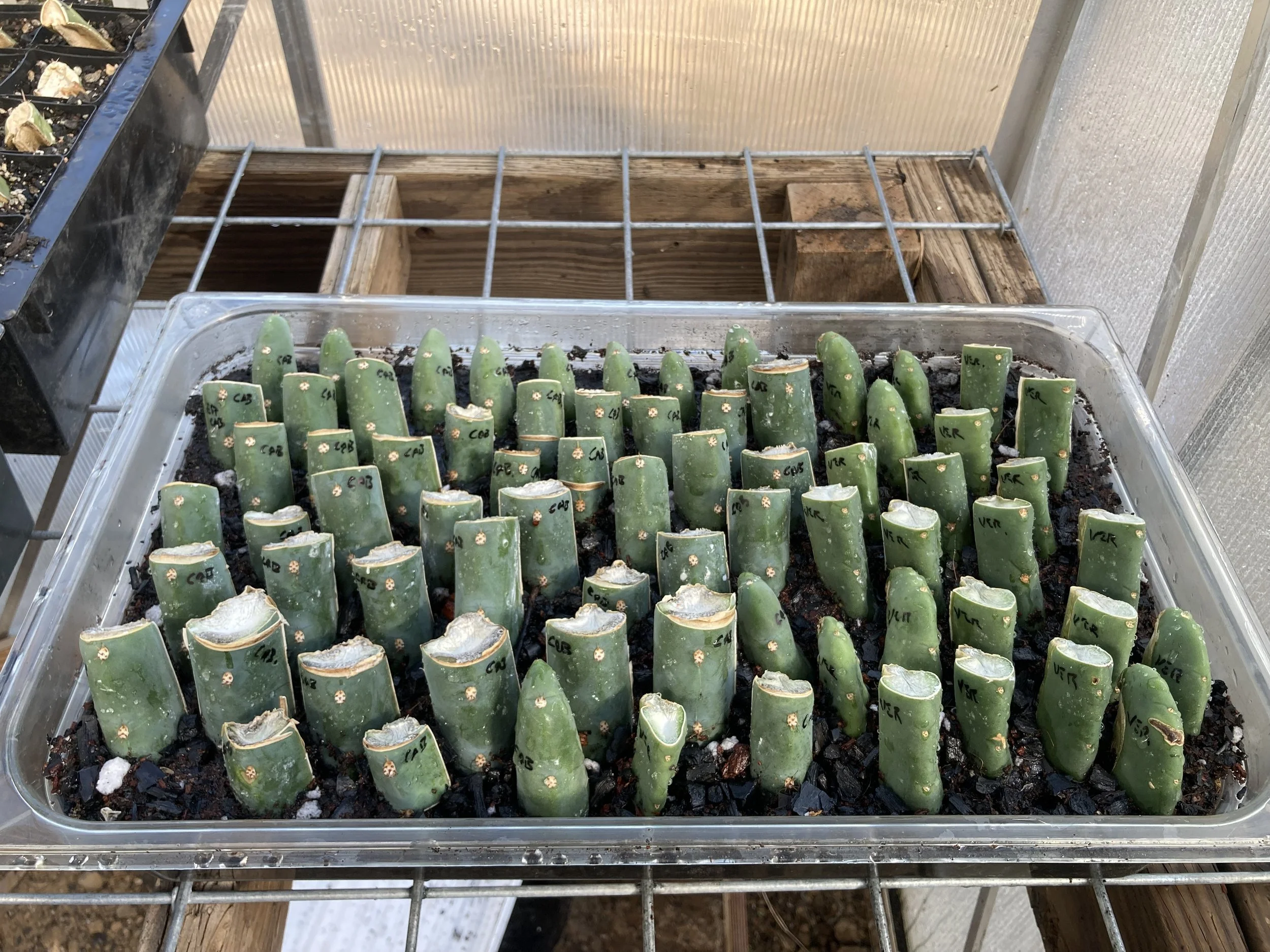 Some failed graft pucks. Rooting on these has often been slow, but once I started planting them more upright like this instead of flat, they seemed to root much faster. Failure rate has been surprisingly low, even for some pretty withered and sad small pieces. The riblets I’m making now are considerably larger and healthier for the most part, thus you would think they would perform better.